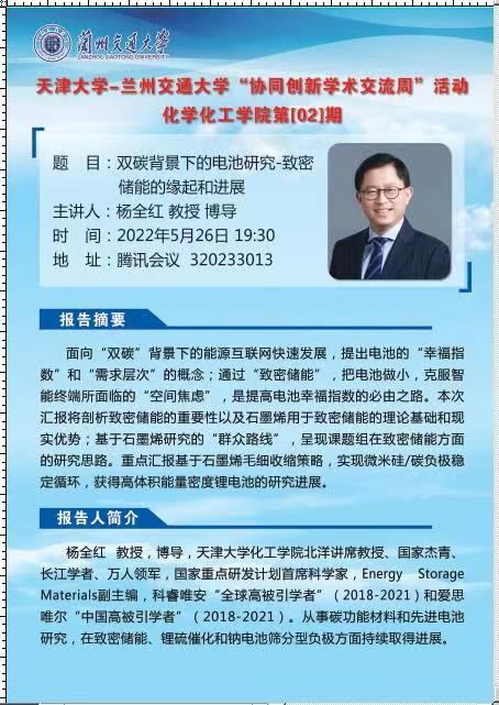 为积极响应天津大学-兰州交通大学学术交流周活动策划,化学化工学院特邀请天津大学教授、博导杨全红和兰州交通大学教授、博导宋学琴两位老师,与两校师生进行学术交流。5月23日宋学琴教授作为第01期主讲嘉宾,以“ZnII-LnIII杂金属超分子体系的组装及性能研究”为题,给两校师生带来了一场学术盛宴。5月26日19:30,天津大学杨全红教授作为主讲人,将以“双碳背景下的电池研究-致密储能的缘起和进展”为题和两校师生展开交流,欢迎各位师生踊跃参与。