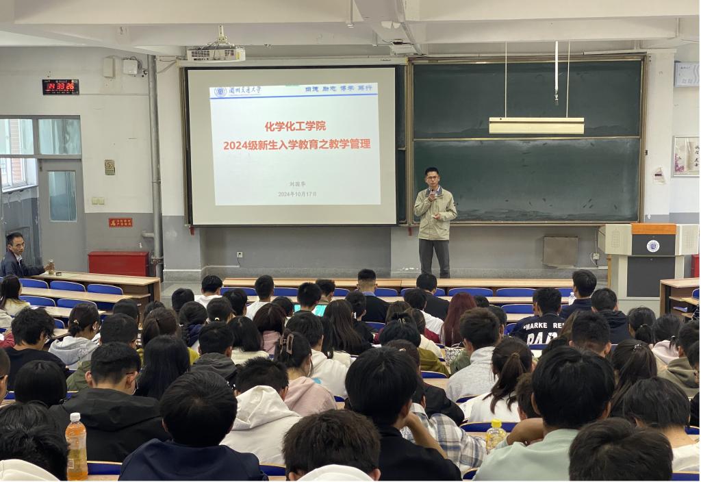 为引导和帮助2024级新生尽快适应新阶段的学习生活,顺利完成角色转变,10月17日,化学化工学院在4教2405教室开展了内容丰富、扎实有效的新生入学教育系列讲座。讲座由学院学工办主任李刚老师主持,教务办主任刘国华老师、辅导员孙紫嫣老师及全体新生参会。