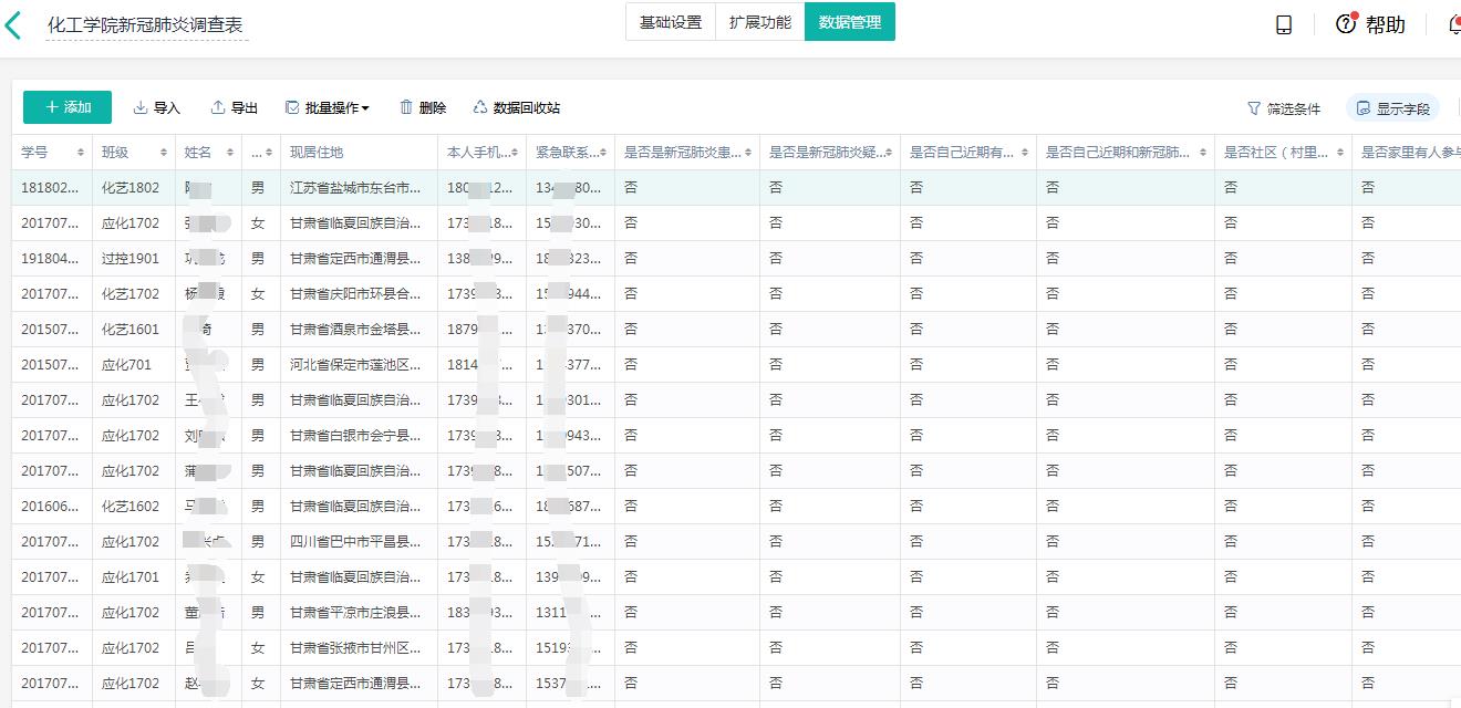 2月初在新冠病毒在全国大范围传播之际,做好全院全部学生的摸底和排查工作。学院要求辅导员对本专业学生全覆盖摸底和排查学生健康状况。利用学院的简道云管理平台,让每位学生填报居家健康状态,特别是重点地区的学生健康情况。根据学生填报的信息,对重点地区的学生逐一电话落实确认学生的身体和心理健康状态,并持续关注和跟踪其健康变化。做到学生全员普遍排查和重点追踪相结合,保证学生真实反映身体健康情况。