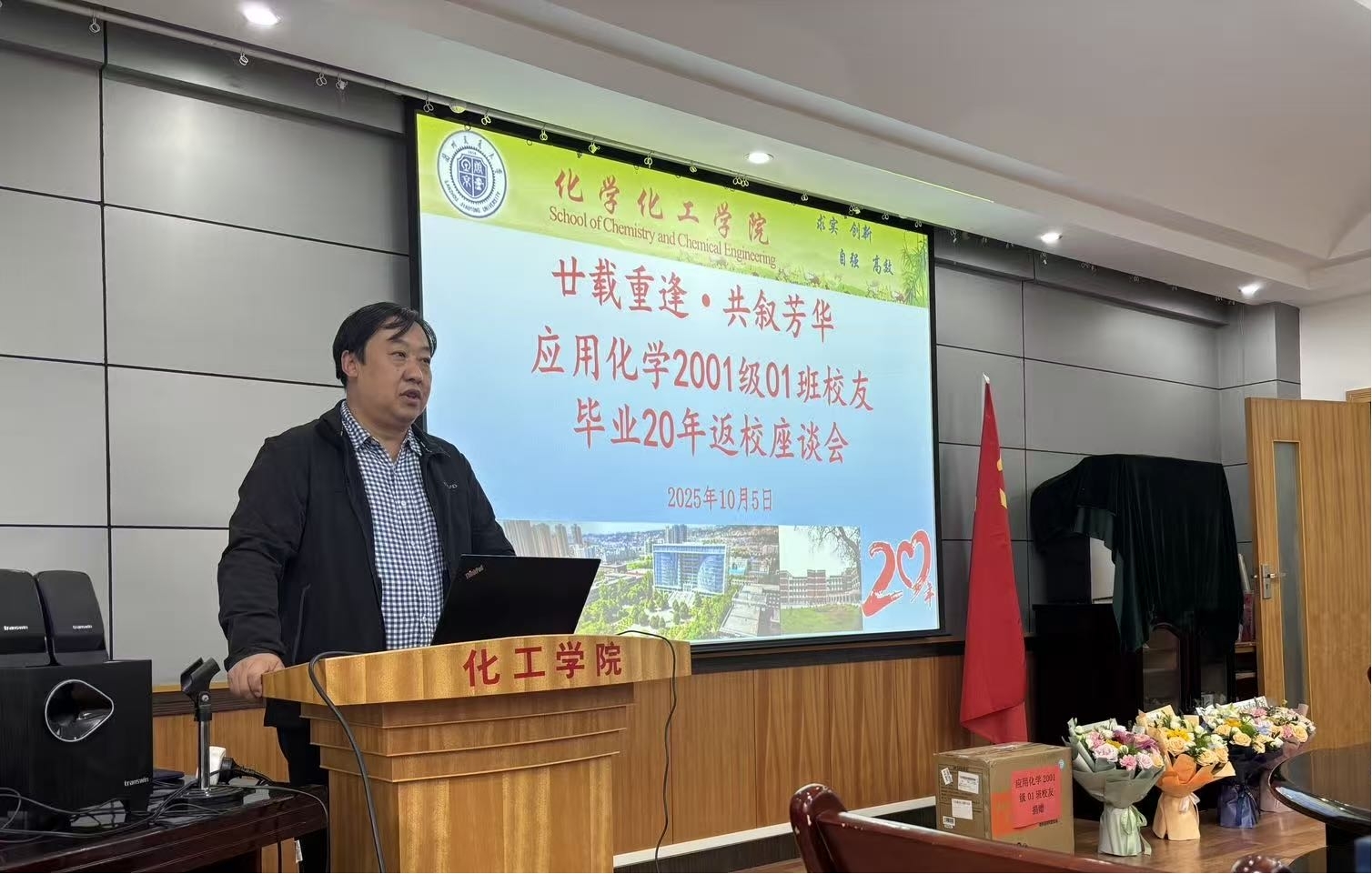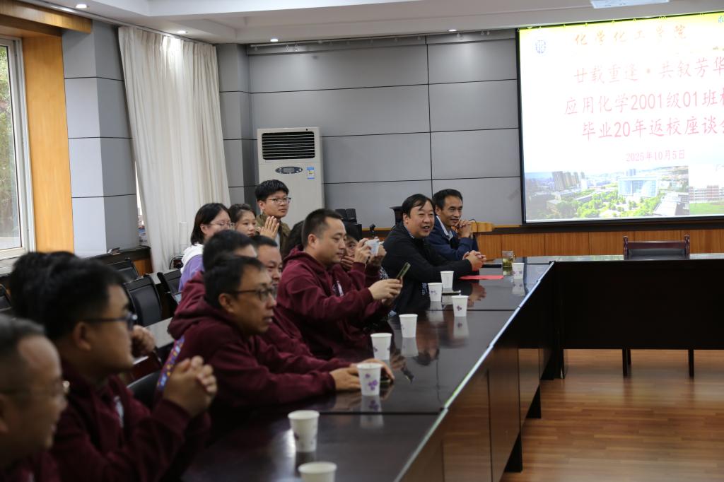 2025年10月5日,化学化工学院迎来了一场意义非凡的校友返校活动,应用化学第一届毕业生,2001级01班校友们在毕业20周年之际,重返母校,追忆往昔岁月,畅谈美好未来。此次活动不仅是对校园岁月的深情回顾,更是对母校未来发展的美好期许。校友返校座谈会在化学化工学院学术厅隆重举行。化学化工学院党委书记、班主任李静萍老师、授课教师郝艳玲、学工办李刚老师等出席座谈会,与校友们共忆往昔。
