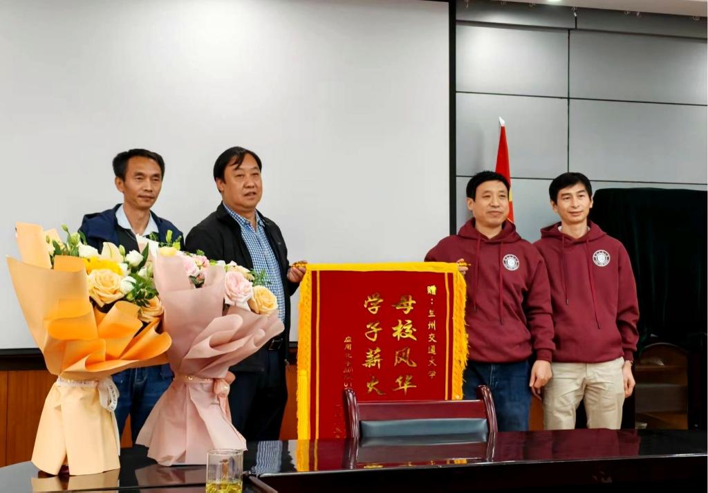 座谈会上应用化学2001级1班同学为感谢母校的精心培养,特意定制了感恩母校的锦旗,并为母校捐赠了纪念赠品。学院党委书记接收了校友赠送的锦旗和赠品。学院党委书记和老师代表向各位校友回赠见证兰州交大历史的纪念品。最后,参与活动的全体校友与学院领导、老师们合影留念,座谈会圆满结束。