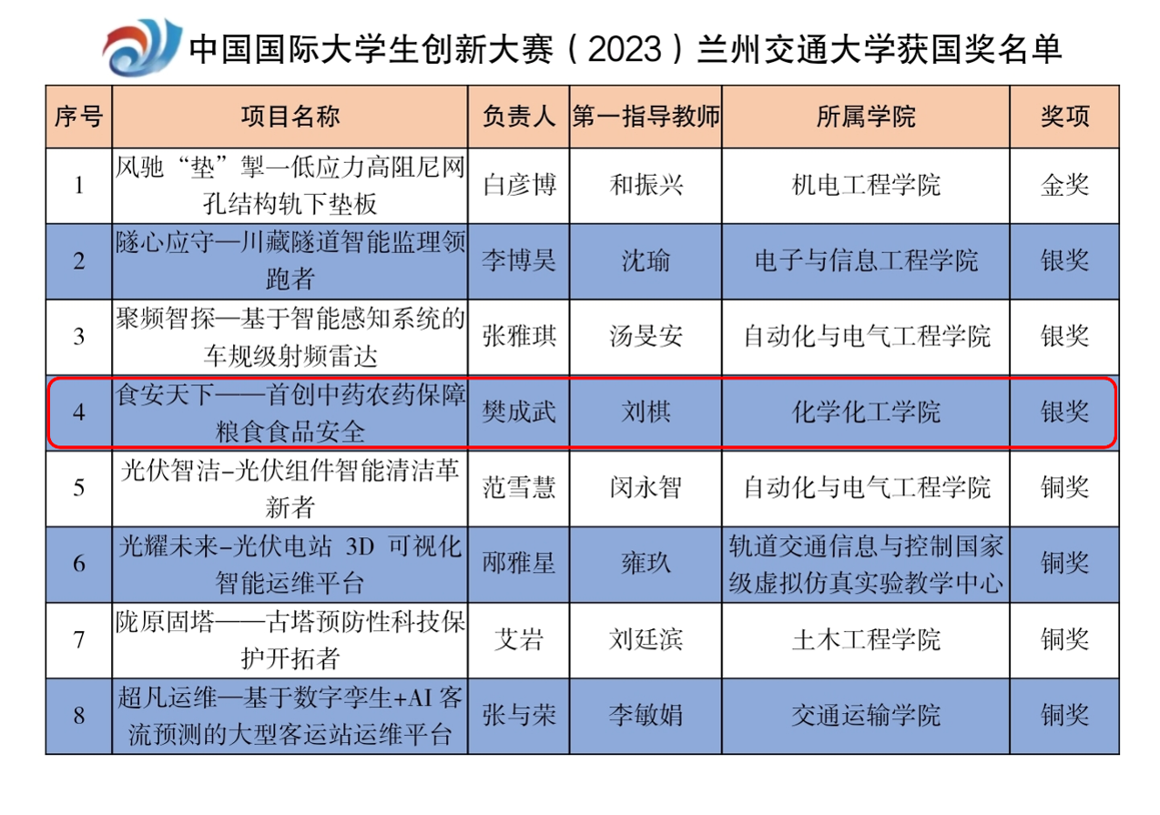 12月3日至6日,中国国际大学生创新大赛(2023)国赛决赛现场赛在天津大学北洋园校区举行,兰州交通大学共有8个项目入围国赛总决赛,其中4个项目通过初赛网评进入全国总决赛现场赛。经过激烈角逐,最终斩获国赛总决赛金奖1项、银奖3项、铜奖4项,我院2021级化学专业硕士研究生樊成武作为负责人的《食安天下——首创中药农药保障粮食食品安全》项目获青年红色筑梦之旅赛道银奖,这是该项赛事自开办以来的九届赛事中,我院首次获得国家级银奖,是我院在该赛事中取得的最好成绩。