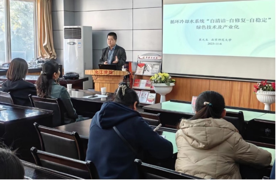 2023年11月6日上午,在化学化工学院二楼学术报告厅,北京师范大学博士生导师裴元生教授应邀,为化学化工学院全体师生作题为《循环冷却水系统“自清洁-自修复-自稳定”绿色技术及产业化》的学术报告。报告会由学院院长赵丽主持。