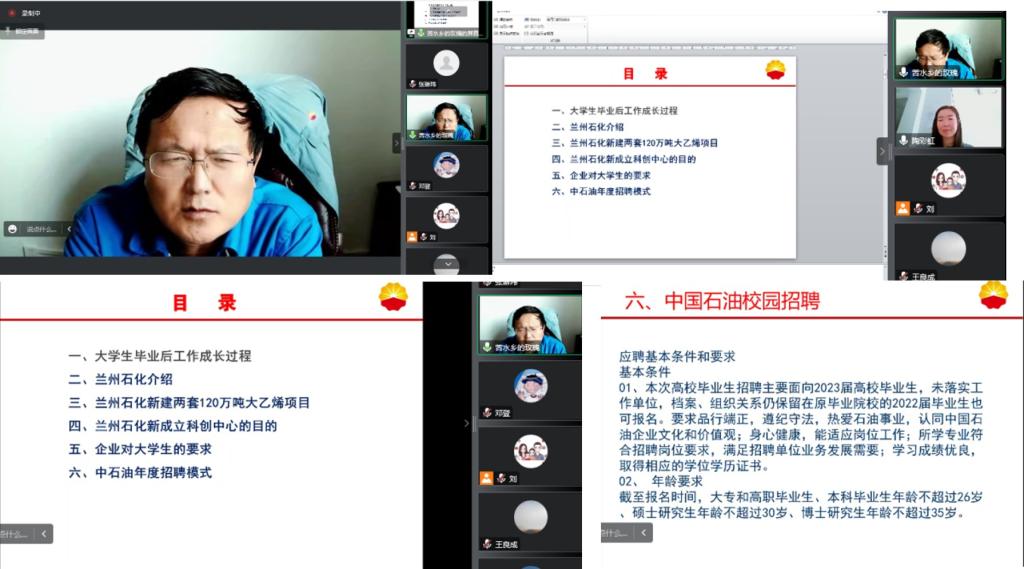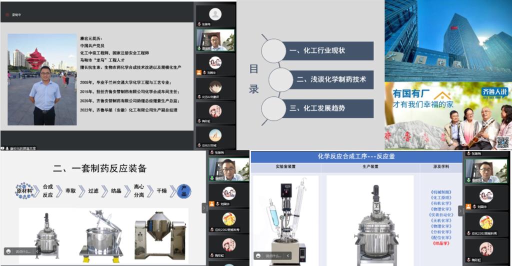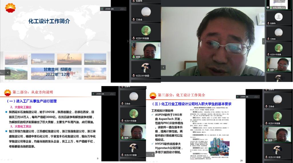 《现代化工专业导论》课程是面向化学工程与工艺专业大一新生开设的专业认知类课程,旨在对现代化学工业风貌与特点进行了一个全面的概述,使学生了解化工专业的学科体系。课程对学生后续整体课程的学习起到引导作用,帮助学生培养专业兴趣、树立专业思维,明确学习目标。为进一步提升大一新生对专业的了解和认知,培养学习兴趣,在学校教务处的大力支持下,学院邀请魏绪玲、康宏元、杨俊明和邸振春等4位专家分别在11月5日、11月12日、11月19日、12月3日14:30-16:30进行了《现代化工专业导论》课程系列在线讲座。学院教学副院长陶彩虹和化工系主任王良成、化工系老师和化学工程与工艺专业22级学生一同参加了讲座。