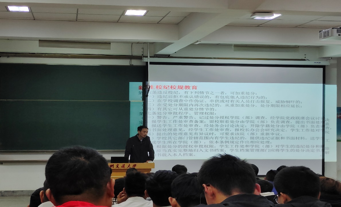 最后,为全面配合我院校纪校风建设工作,同时进一步促进学生管理工作的良性开展,学工办李刚老师对同学们进行了校纪校规教育。李主任参照《普通高等学校学生管理规定》以及《兰州交通大学学生违纪处分办法》的内容,要求同学们转变思想,积极上进,引导大家积极争做遵规守纪、文明礼貌的新时代大学生。