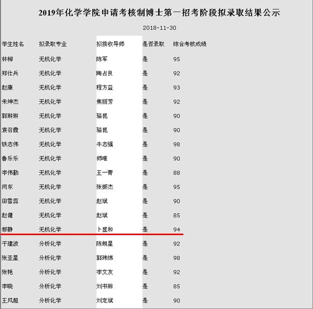 郝静同学学习刻苦努力,科研积极主动,目标定位清晰。在读研期间以第一作者发表SCI论文四篇,曾获国家奖学金,一等学业奖学金和二等学业奖学金。此次博士入学考试中,郝静同学经过严格的综合考核,以优异的成绩被南开大学化学学院拟录取为2019级博士研究生。这说明考取博士是郝静同学孜孜以求,辛勤奋斗的结果。愿郝静同学继续用汗水织就实力,用毅力成就梦想,用拼搏铸就辉煌,不忘初心,砥砺前行,谱写出自己更为辉煌的人生篇章。