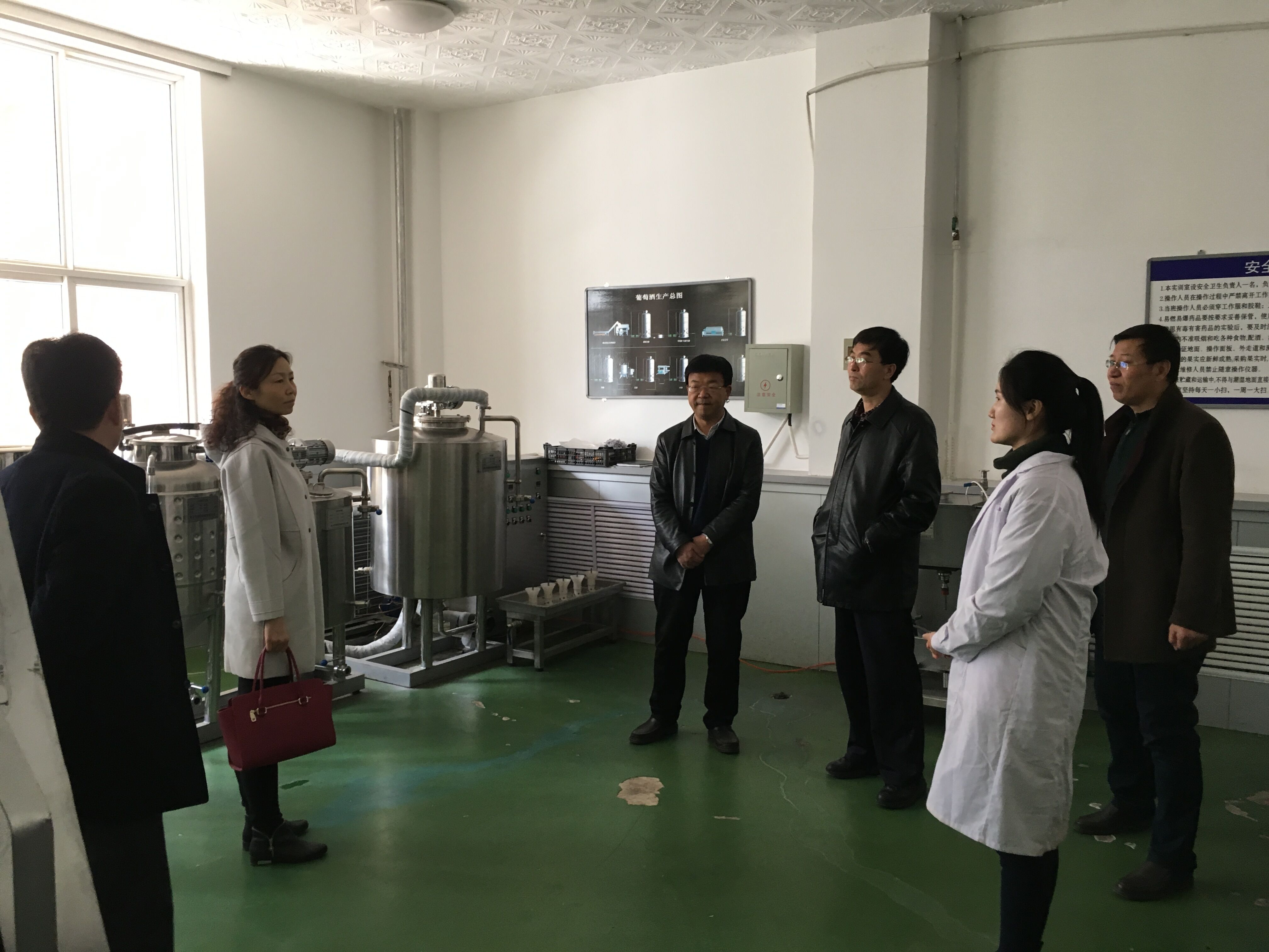 在生物工程系党委书记张志刚、系主任赵凤舞、副系主任王剑虹陪同下,化工学院领导先后参观了果酒(葡萄酒)生产基地、啤酒生产基地、酸奶实训室、菌种实验室及环境监测实验室等。学院领导重点学习和考察了实训基地、实验室的布局、硬件配备、功能定位、实验室功能拓展等内容,双方领导并就实验室建设、管理、使用和开放等相关内容进行了深入交流。