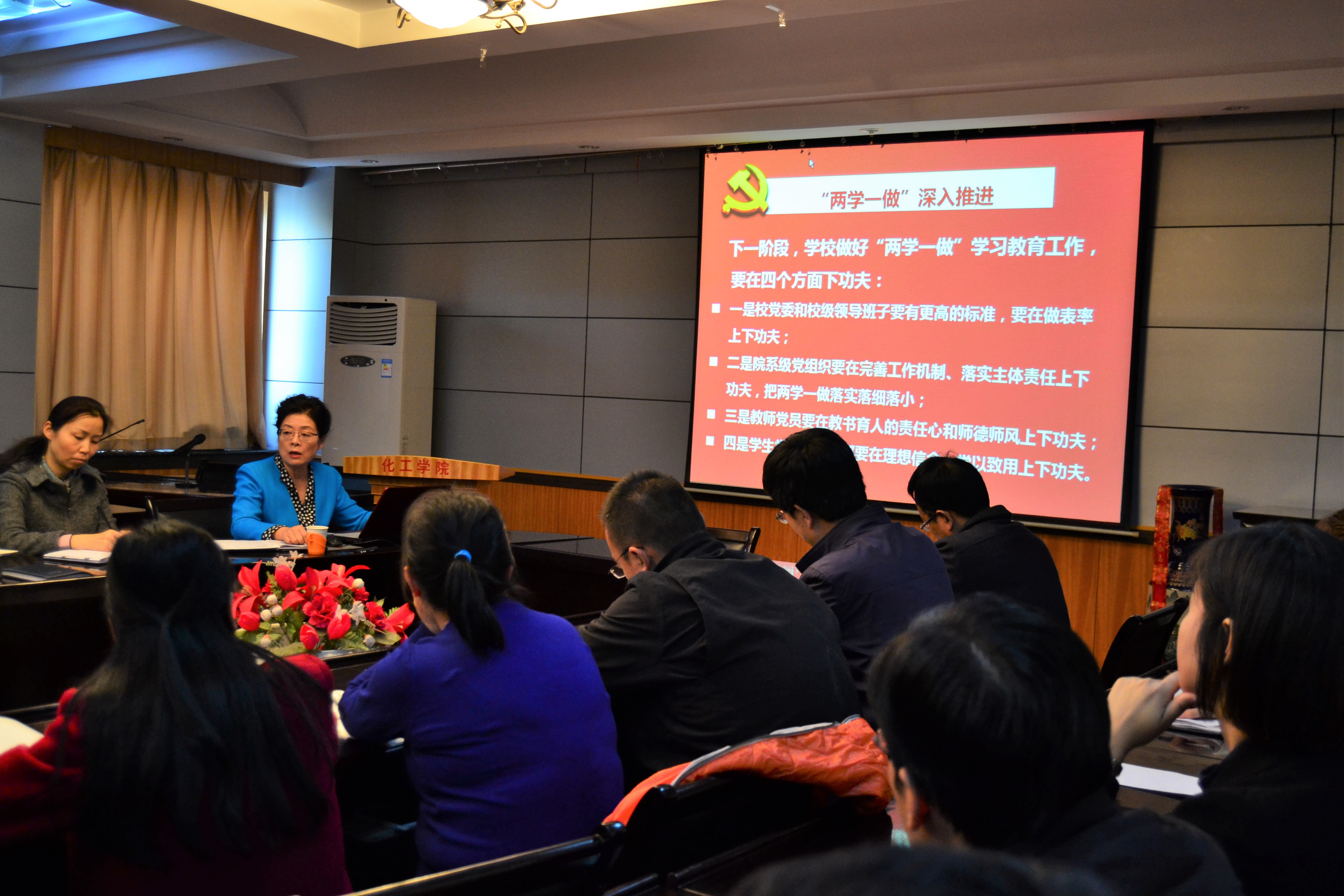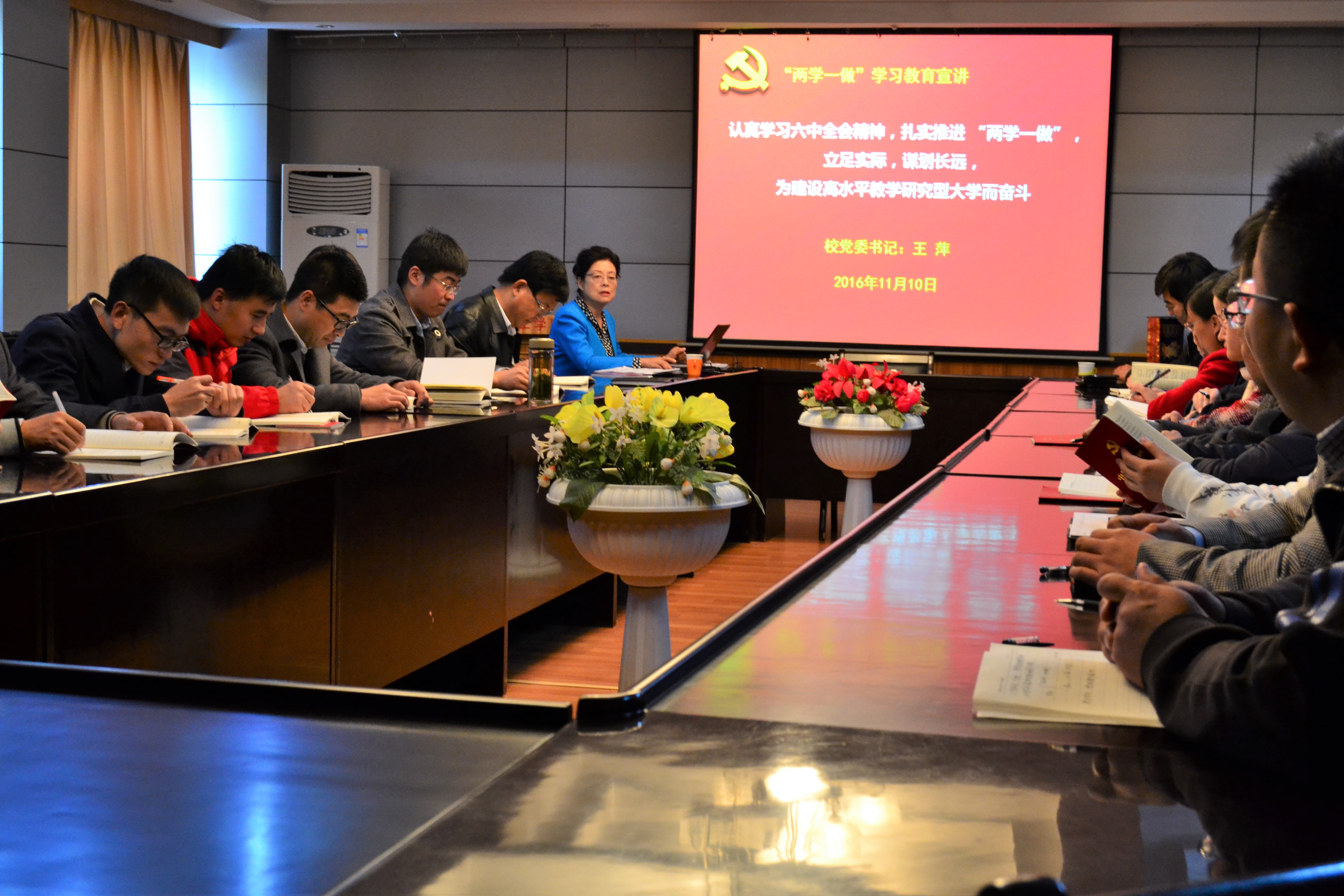 11月10日下午,校党委书记王萍以《认真学习十八届六中全会精神,扎实推进两学一做,立足实际,谋划长远,为建设高水平教学研究型大学而奋斗》为题,为化工学院全体教工党员讲授专题党课。党委组织部部长陈静、化工学院党委成员及全体教工党员参加。