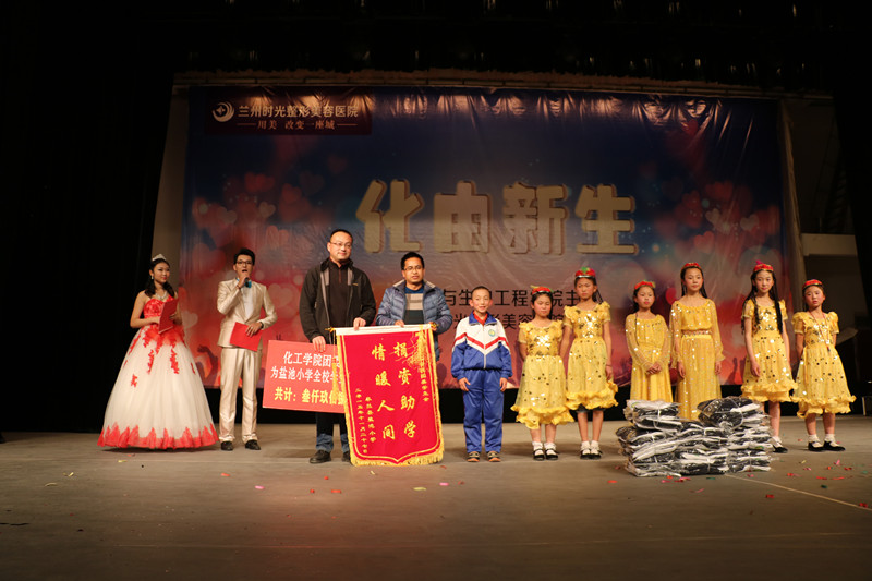晚会中还邀请到化工学院团委学生会开展志愿服务活动的的盐池沟小学的师生代表登台表演,表演结束后学院副书记、副院长周渊将前期团委学生会爱心捐赠活动中募集的45套校服向学生做了捐赠,盐池沟小学校长将一面绣有“捐资助学 情暖人间”的锦旗转赠,对学院开展志愿服务活动表示感谢。
