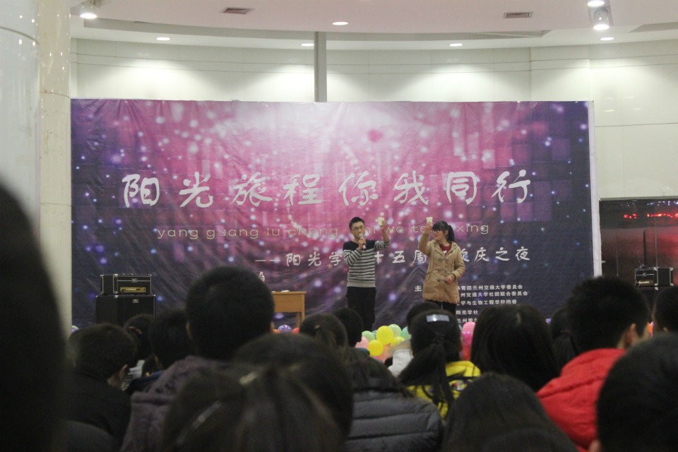 2014年11月21日19点,由共青团兰州交通大学委员会、大学生社团联合会、化工学院团委主办,阳光学社承办的大型文艺演出之 “阳光旅程,你我同行”十五周年庆典晚会在大学生活动中心举行。与会嘉宾有化工学院团委书记孔繁昕老师、经济管理学院王莉老师、罗莉老师、社团联合会主席李建兵、社团联合会副秘书长穆裕、阳光学社各主席、赞助商代表杜学帧女士、化工学院学生会代表、青年志愿者协会代表、留学生代表及兄弟社团代表,共计400余人参加本次活动。