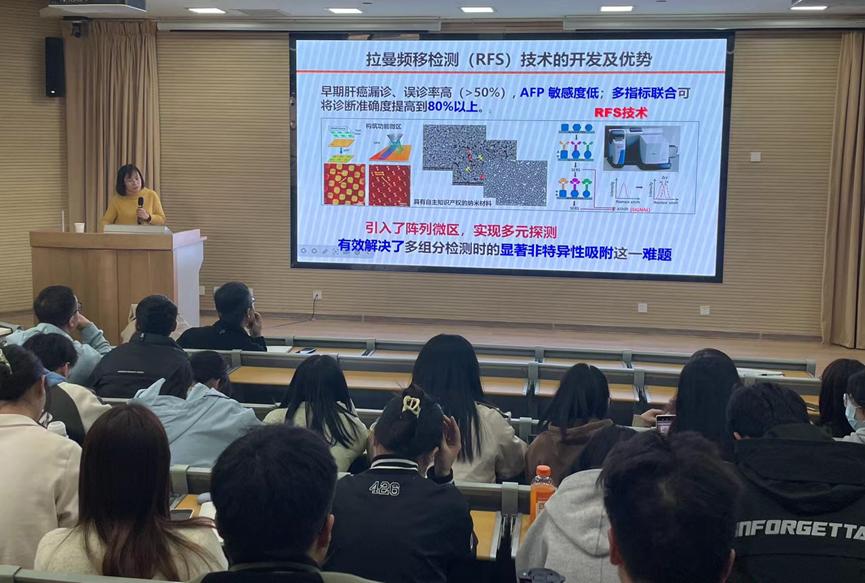 报告结束后,李敏研究员细致耐心的回答了师生关于表面增强拉曼散射技术在微纳尺度上开发的实验技术问题,以及为师生们分享了拉曼频移检测技术在医学临床开发领域的应用展望。