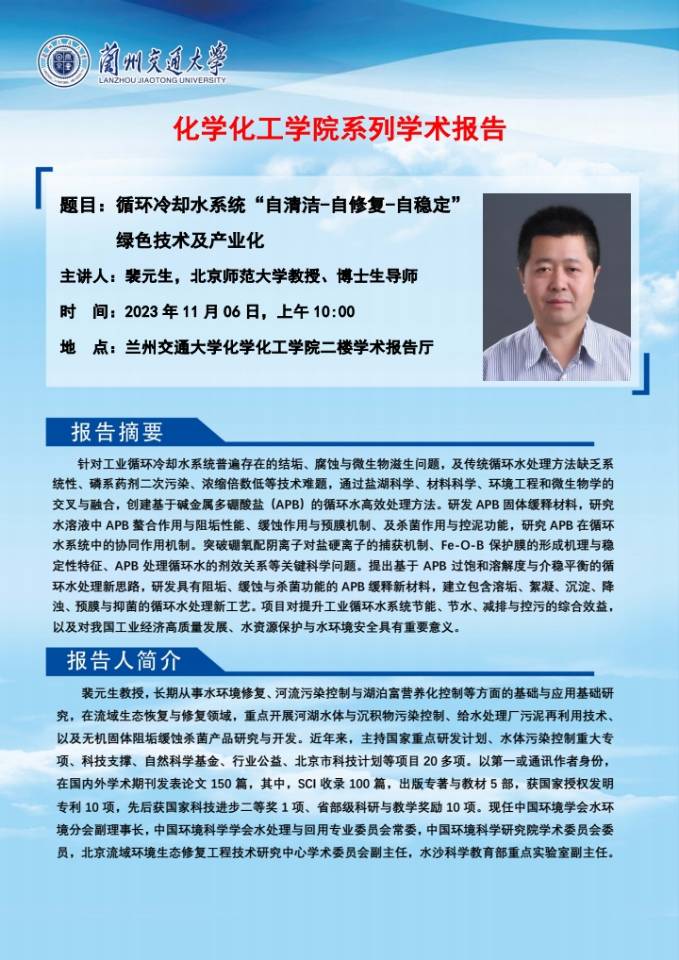 会议地点:兰州交通大学化学化工学院二楼学术报告厅
